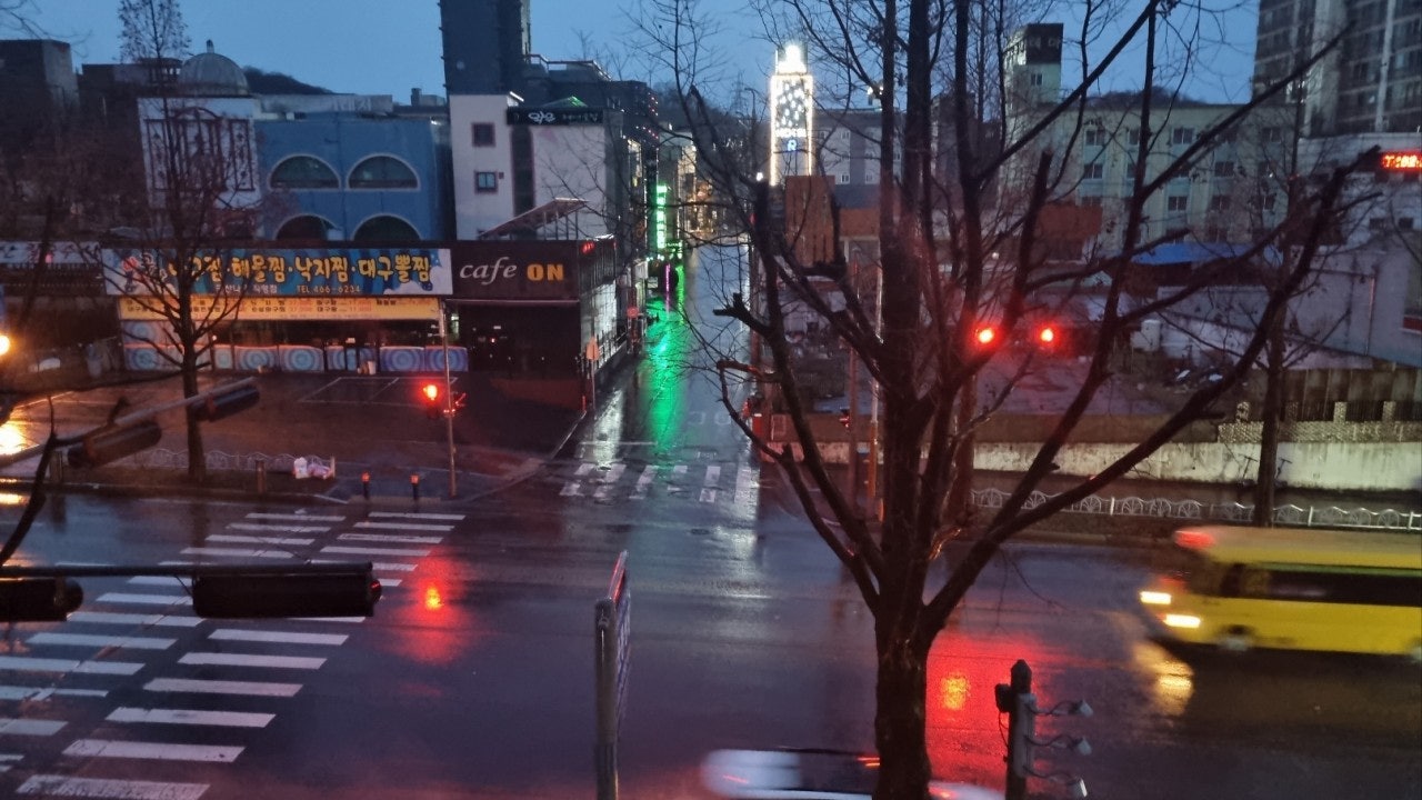 빗물에 젖은 도로 위로
