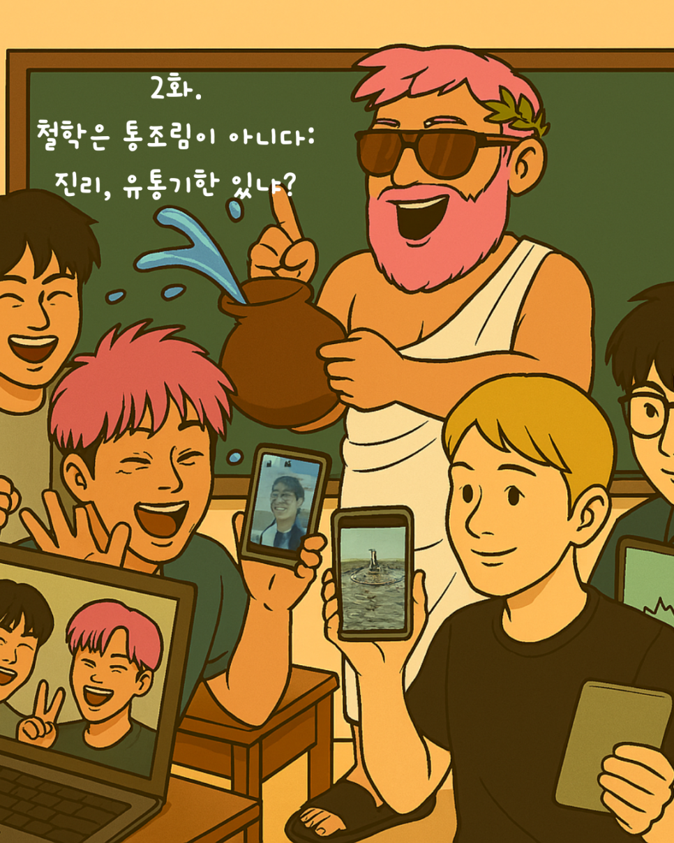 “진리가 물이라고? 웃기지 마세요. 요즘 세상은 물이 아니라 ‘거품’으로 만들어진 겁니다. 주식도 거품, 코인도 거품, 내 통장 잔고도 비누거품처럼 사라지는데 무슨 본질 타령이에요. 탈레스 형님도 지금 태어났으면 워터파크 사업하다가 상장 폐지 당했을걸요?”