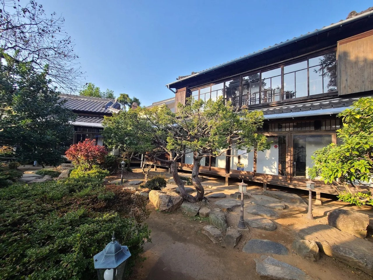 히로쓰 가옥을 방문하기에 가장 좋은 시간은 오후 세 시에서 다섯 시 사이다. 이 시간에 햇빛이 서쪽으로 기울면서 정원의 석등과 나무 사이로 긴 그림자가 드리운다. 1층 마루에 앉으면 열린 문 너머로 정원이 보인다. 정원 한가운데 놓인 석등은 밤에도 불이 들어오지 않지만, 오후의 빛이 석등의 돌 표면에 부딪혀 만드는 그림자만으로도 충분히 아름답다.
