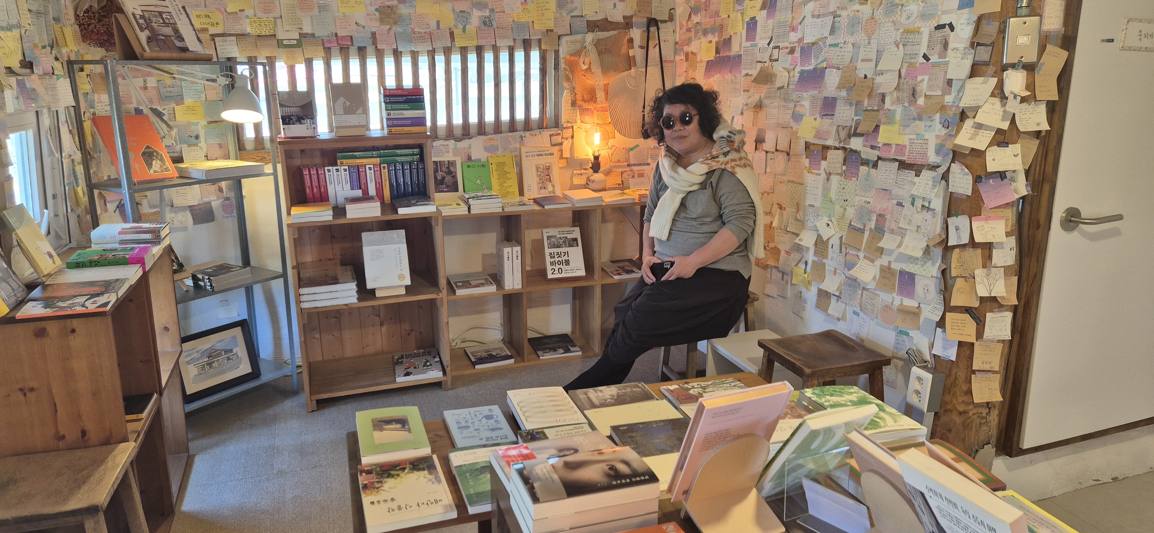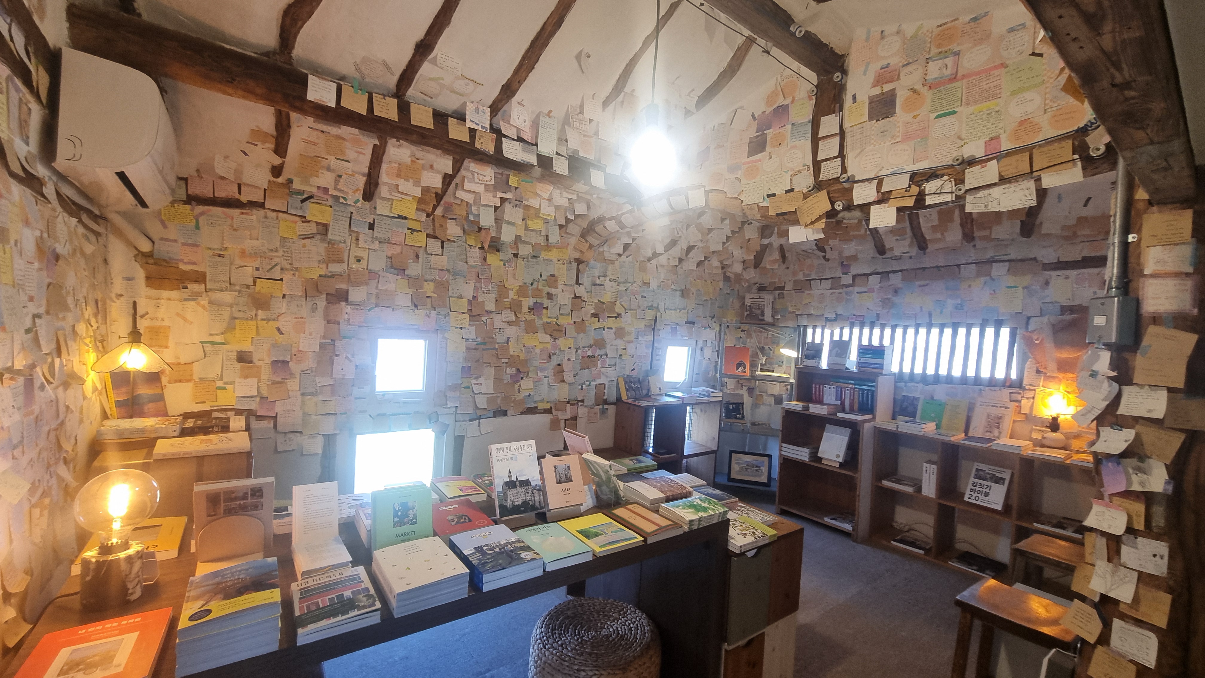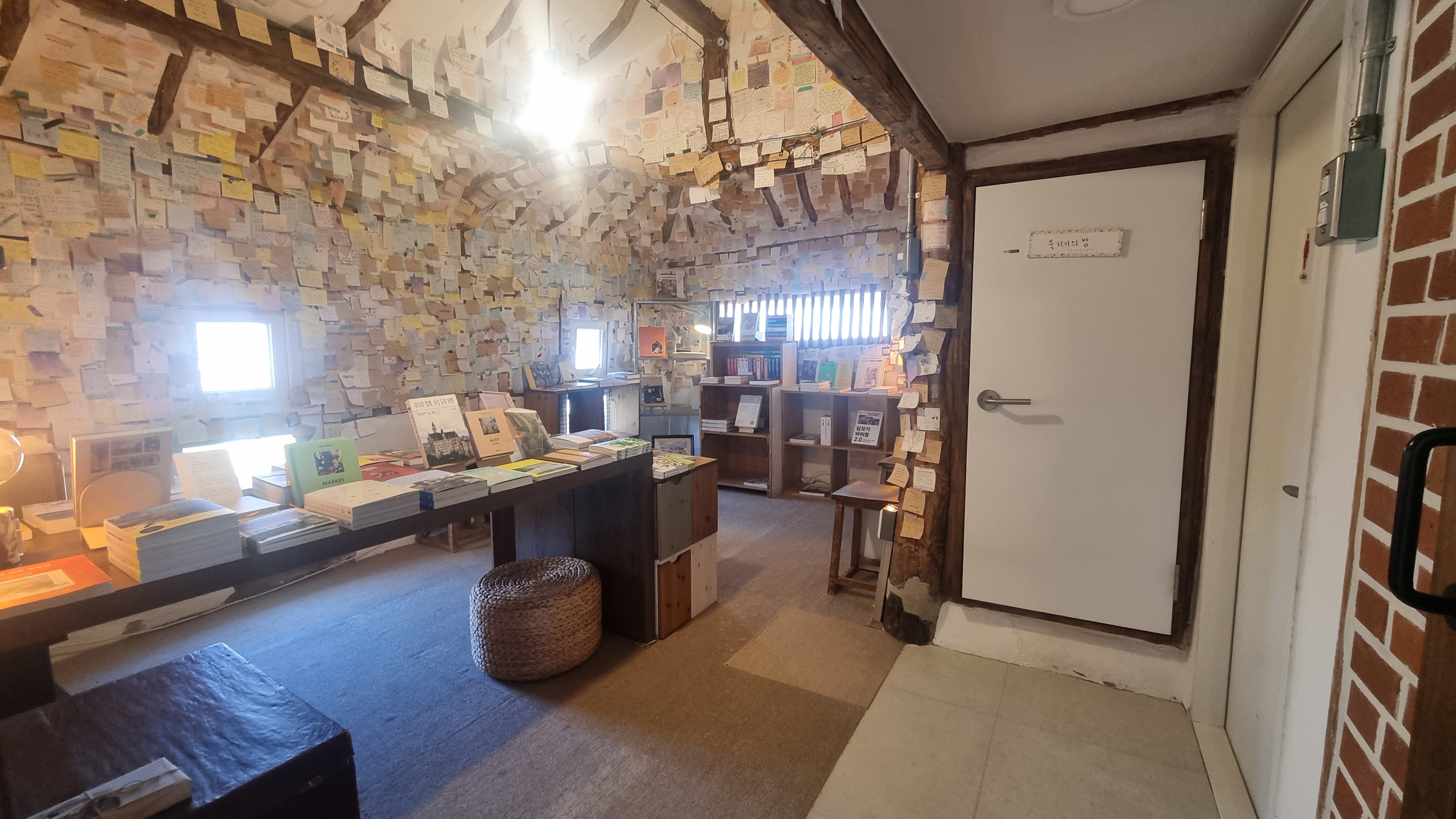 문을 열자, 세상이 종이와 잉크로 가득했다. 천장과 벽, 기둥까지 빽빽하게 붙은 손 글씨들. 누군가의 하루, 다짐, 고백이 종이 위에 눌러 앉아 있었다. 그 수많은 문장들이 서로 기대어 하나의 거대한 이야기처럼 보였다. 마치 흙이 꽃이 되는 순간처럼, 이곳에서는 말이 풍경이 되고 마음이 공간이 되었다.